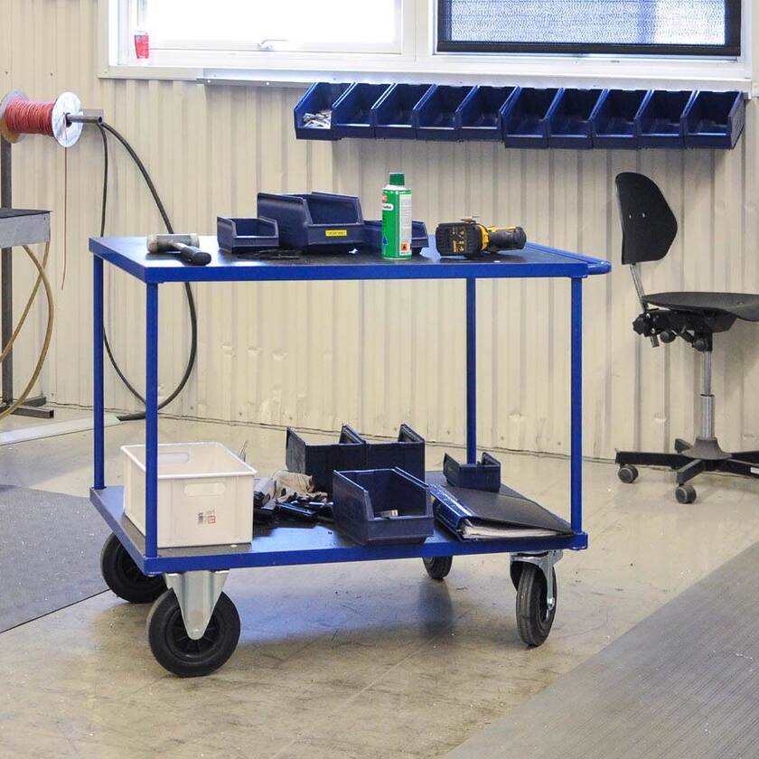 Vår klassiska bordsvagn har ett blålackerat alternativt elförzinkat metallstativ och plan i MDF-direktlaminat alternativt galvaniserad stålplåt.
