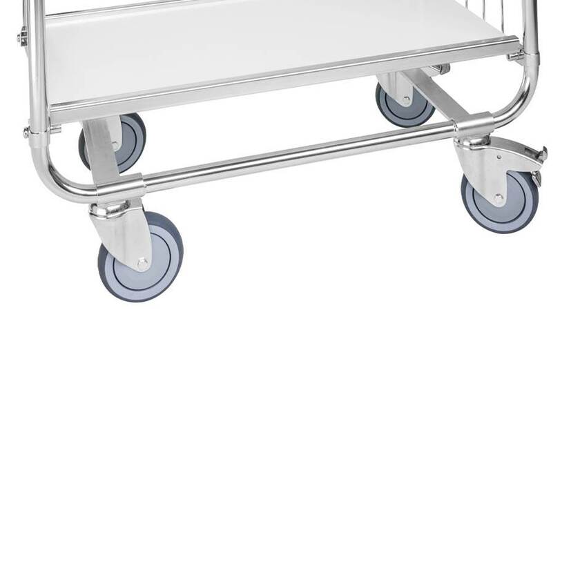 Flexibel plockvagn 250. Med två stycken hyllplan i 12 mm vit laminat som är steglöst justerbara i höjd. Plockvagnen har elförzinkade gavlar och hyllkanter. Grålackerat handtag som kan justeras till ergonomiskt optimal höjd.. Försedd med 4 st länkhjul Ø125 mm. Önskar du broms på ett ett av plockvagnens hjulpar är detta valbart i rullistan nedan.