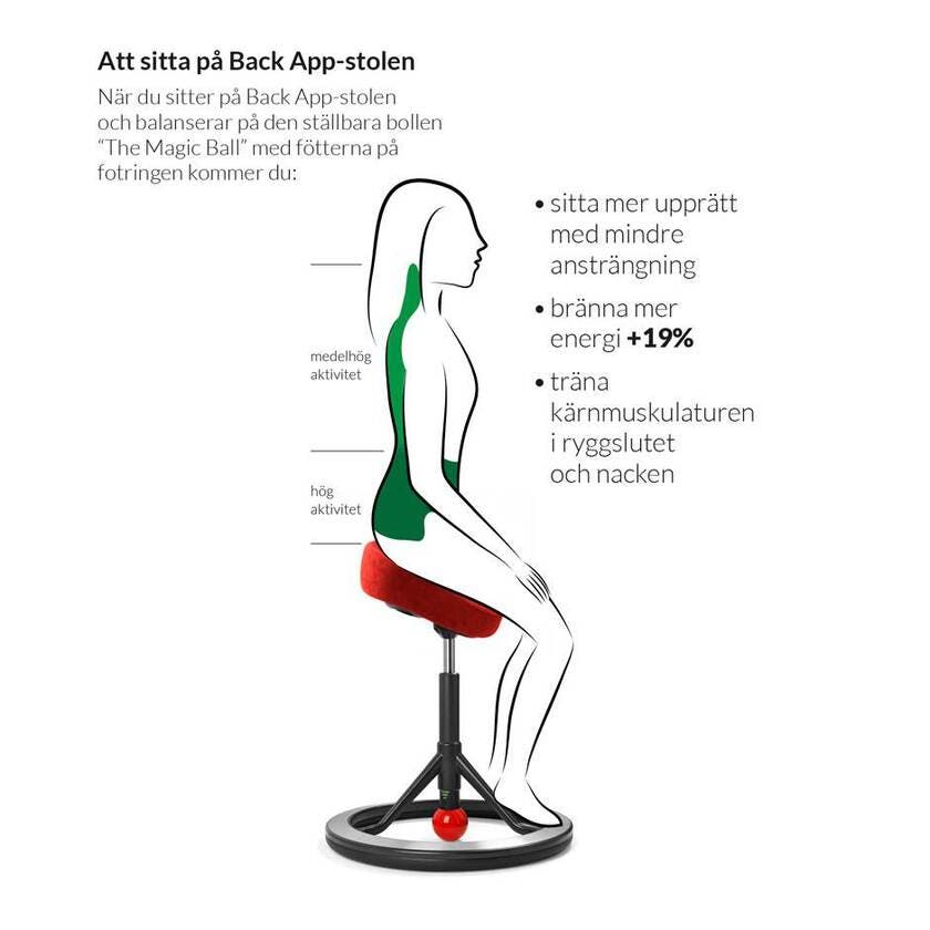 På Back App Chair sitter du med fötterna på en fotring med ett dämpande polster. Fotringen och de rörelser som uppstår när du balanserar på den centrala kulan, leder till den goda och komfortabla känslan du upplever när du sitter på en Back App Chair. Det är en stol som ger dig något extra. Genom att vända på stolen och vrida på den röda kulan så ställer man höjden på kulan i förhållande till fotringen, på det sättet justerar du lutningsrörelsen som bestämmer hur mycket kroppen behöver kompensera för att behålla balansen.