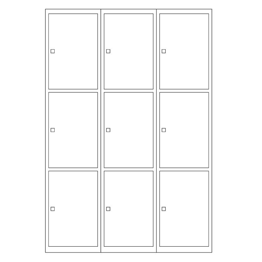 Sektion med 3 x 3 luckor, totalt mått B900 x D400 x H1940 mm. Sockelns höjd 140 mm. Välj mellan klinka för hänglås eller cylinderlås. Huvudnyckel finns som tillbehör.