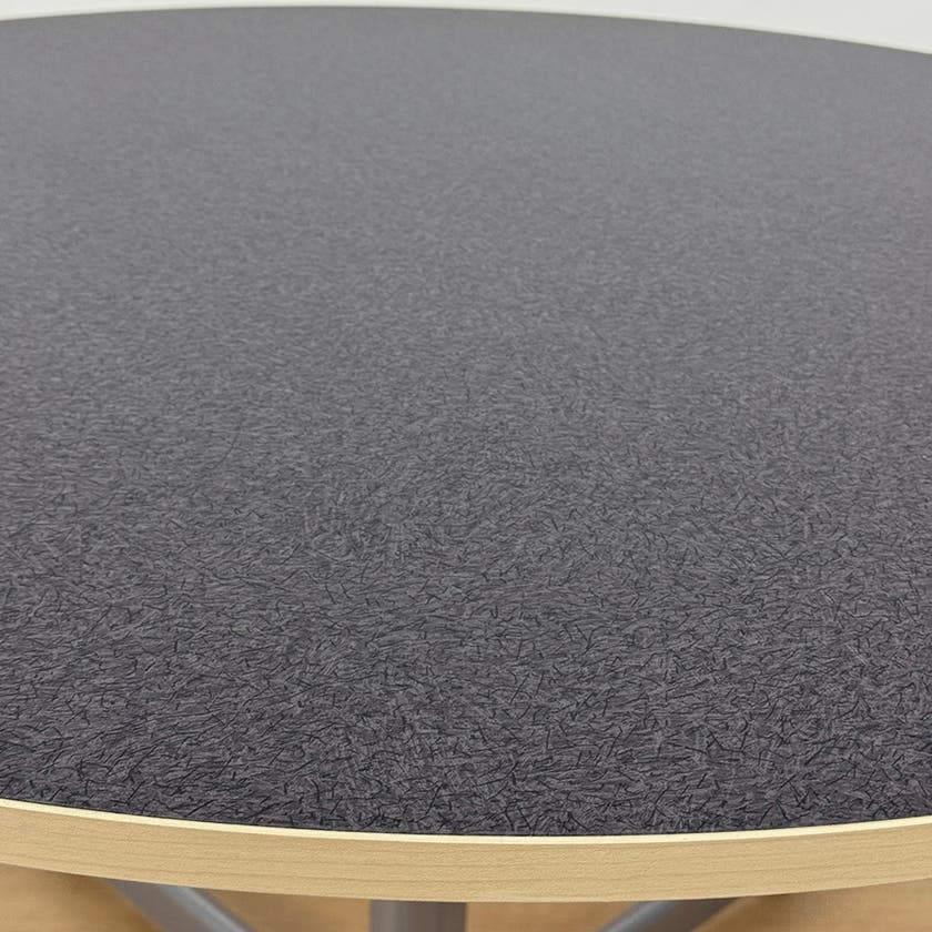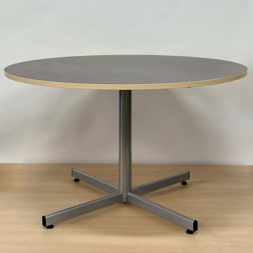 Runt bord med skiva Ø1200 mm i mönstrad, mörkgrå laminat med träfärgad kantlist. Stabilt X-stativ i grå färg, försett med ställfötter. Gott skick.