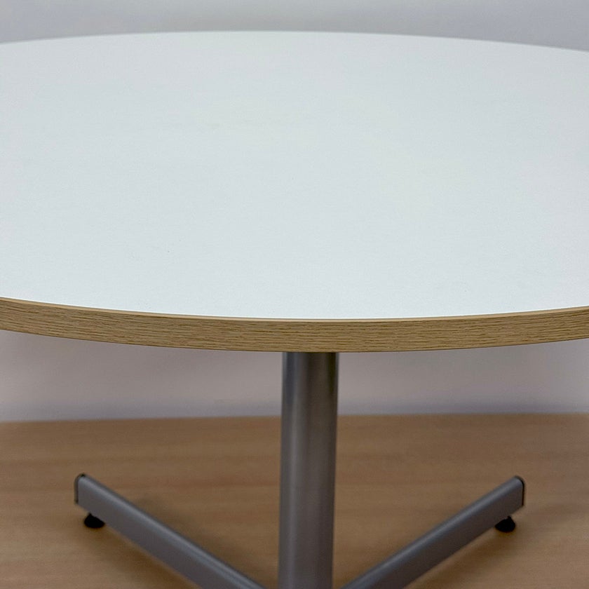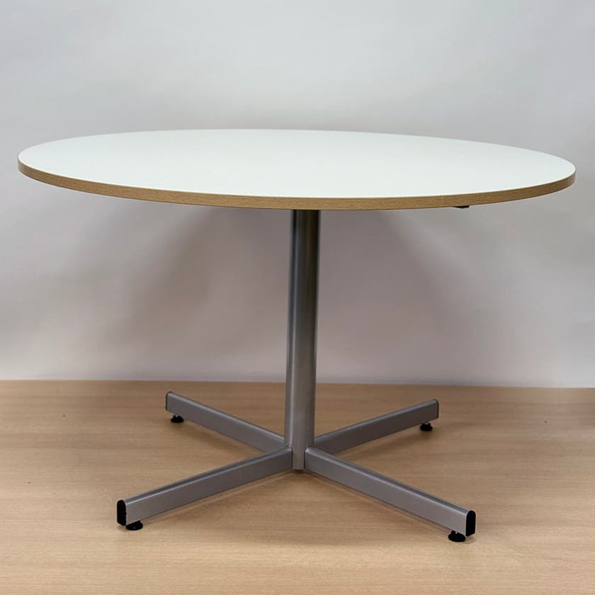 Runt bord med skiva Ø1200 mm i vit laminat med träfärgad kantlist. Stabilt X-stativ i grå färg, försett med ställfötter. Gott skick.