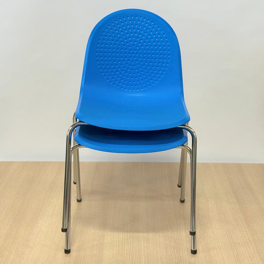 Paket med 2 st stolar Amigo med blått sittskal i plast och kromat underrede. Stolarna är varuprover som aldrig använts och således i nyskick.