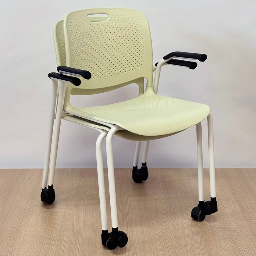 Paket med 2 st stolar. Stolarna har hjul och armstöd. Sits och rygg i vit plast, vitlackerat stålunderrede. Dessa stolar är varuprover som aldrig använts och är således i nyskick.