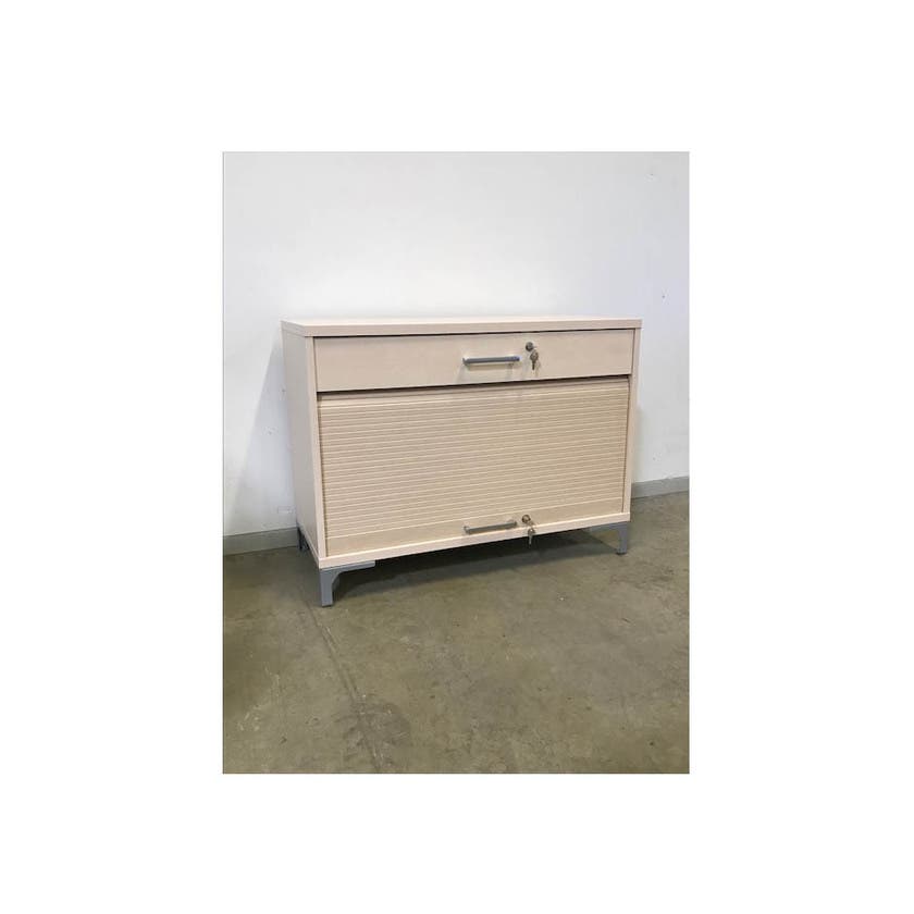 Jalusiskåp i vår serie Quantum. Tillverkat i björklaminat med silvergrå handtag. Liggande jalusi och låda. Försett med benstativ. Skåpet har ett plan. Mått 900 x 420 x 680 mm.