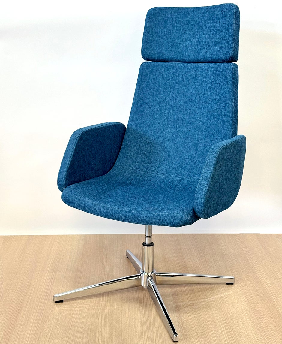 Läcker loungefåtölj i blått tyg med kromat underrede. Endast använd i vår utställning och i absolut nyskick.