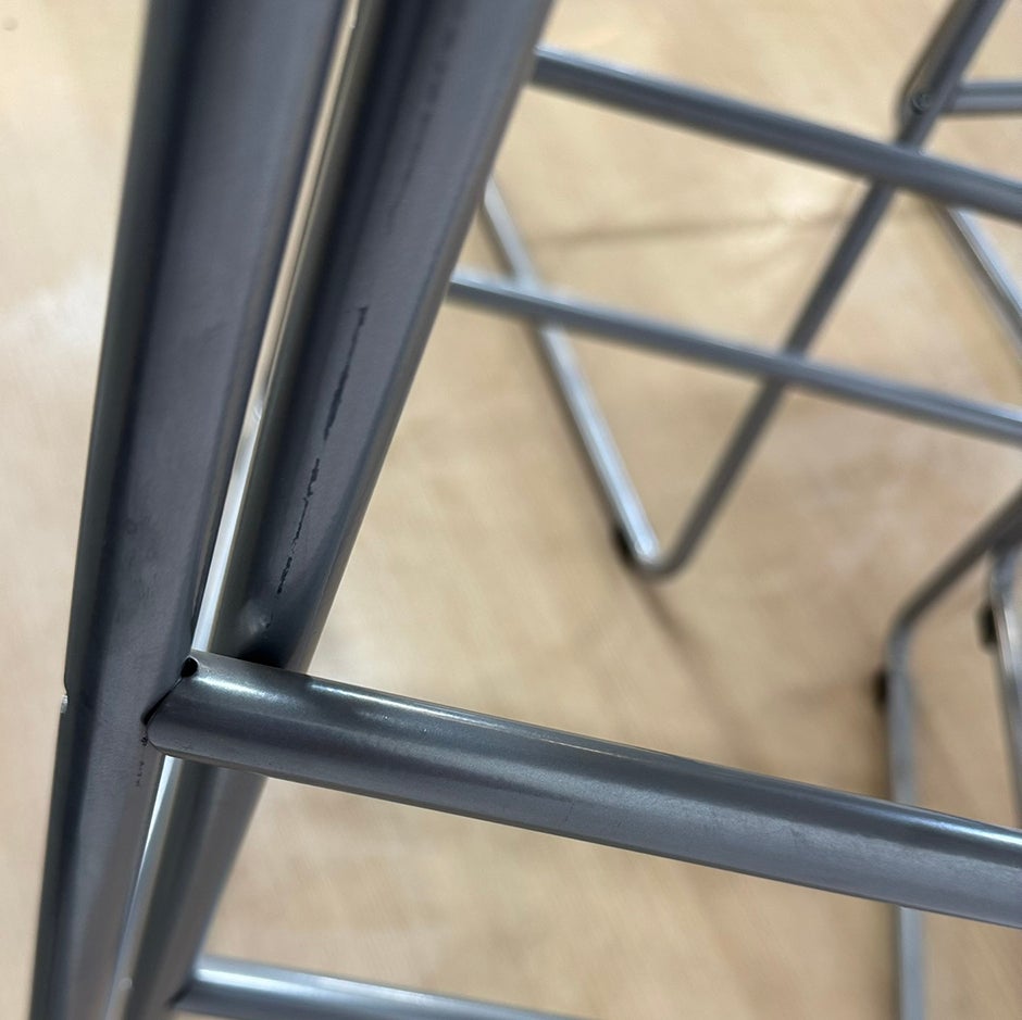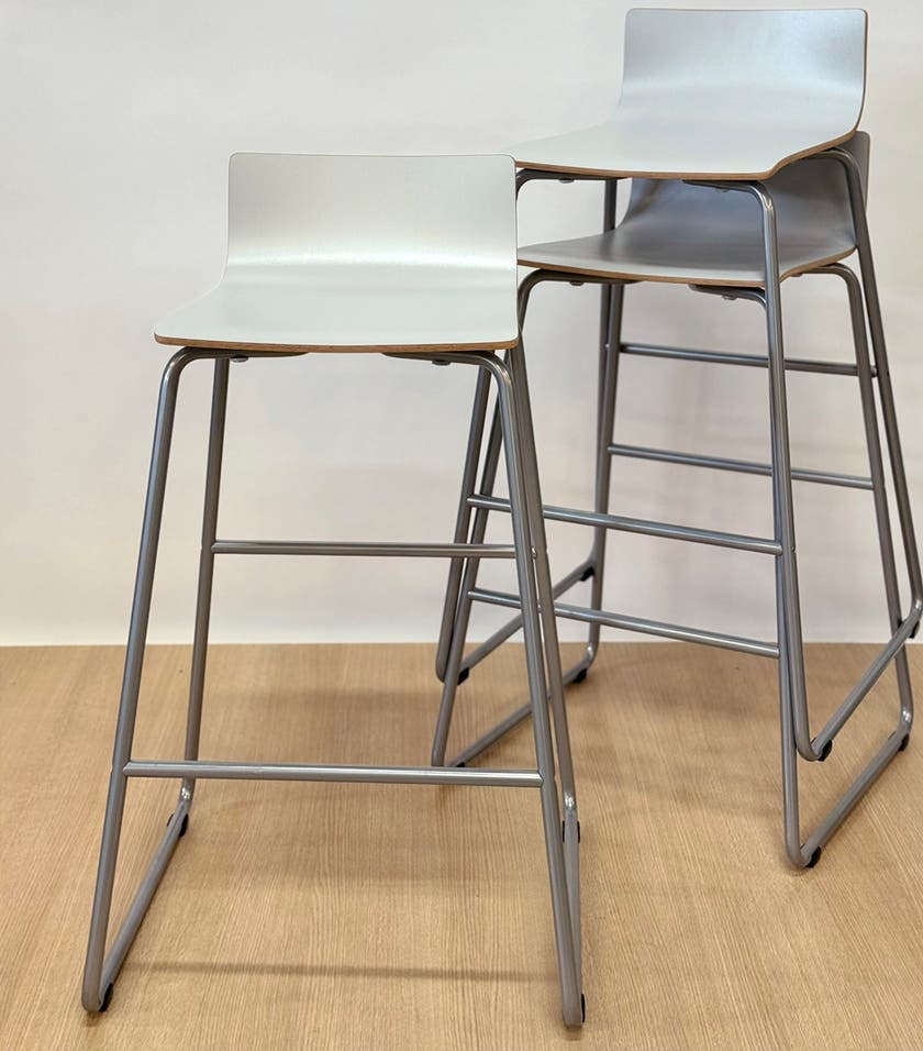 Paket med tre barstolar i serien Café VII. Ljusgrått sittskal och grålackerat underrede. Ett stativ har en mindre repa till följd av stapling, i övrigt är stolarna som i nyskick.