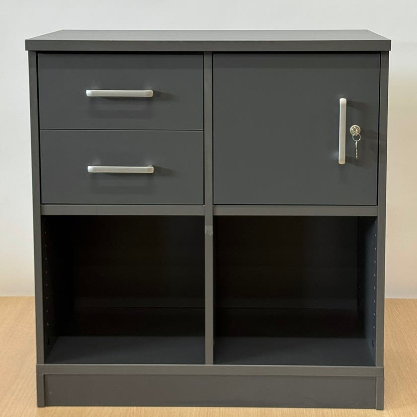 Kubhylla i serien Quantum, grafitgrå laminat. Fyra fack, komplett med två insatser, en tvålådig och en låsbar med lucka. Mått B820 x D420 x H873 mm. Ett mindre skav på stommens framsida, i övrigt i mycket gott skick.