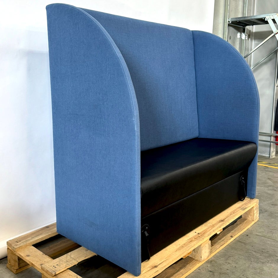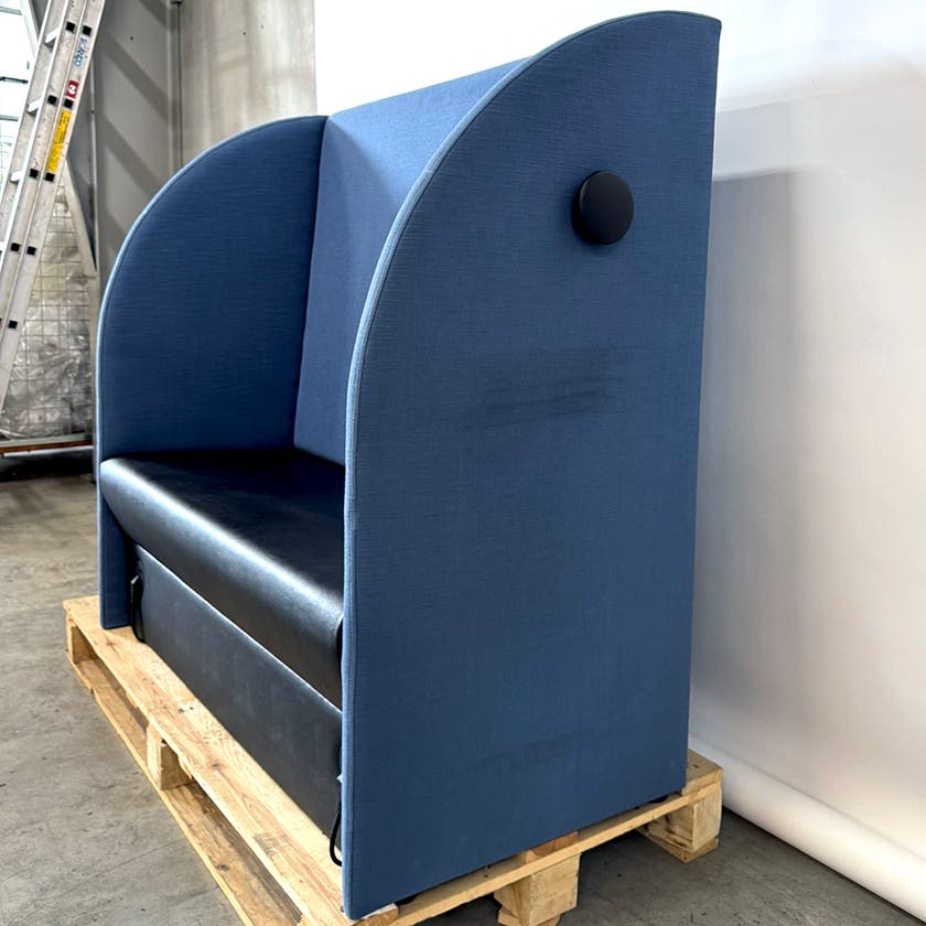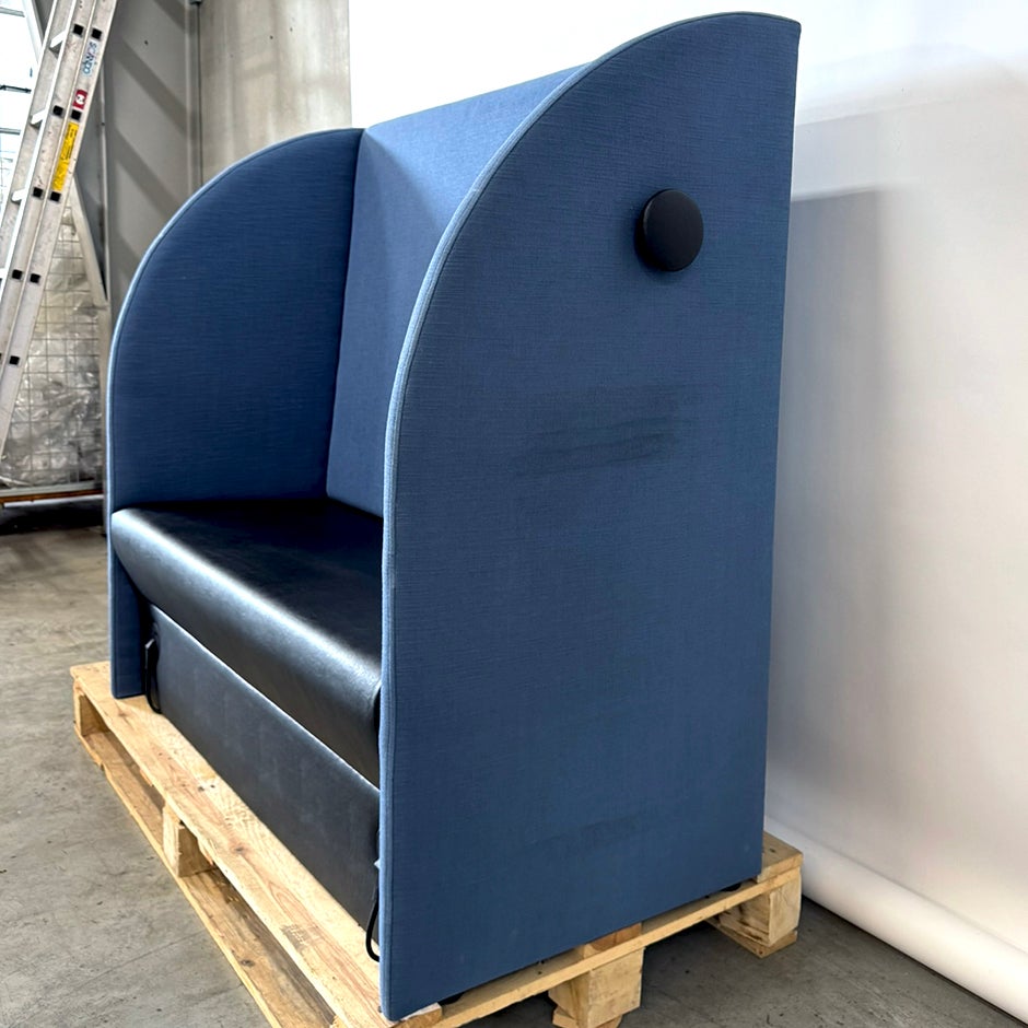 Soffa från Sitz Design. Höga sidor och rygg i blått tyg, sits i konstläder. Försedd med eluttag. Märke i tyget på soffans högra sida, i övrigt i bra skick.
