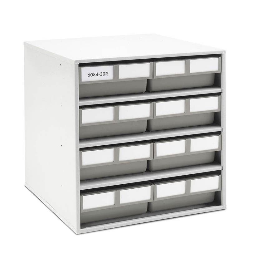 Ett stopp håller lådorna kvar i kassetten när de är fullt utdragna. Baksidan av kassetten har hål för väggmontering. Som tillbehör finns tvärgående mellanvägg. Lagerkassetten passar till golvkarusell med artikel nummer 011-00703.
