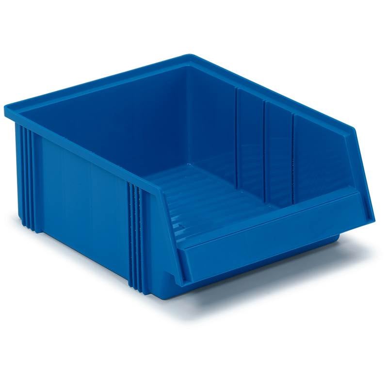 Lådans botten är korrugerad, vilket hindrar smådelar att glida undan och underlättar plockning. Den låga fronten gör att lådans innehåll blir synligt samt lätt och snabbt kan plockas.