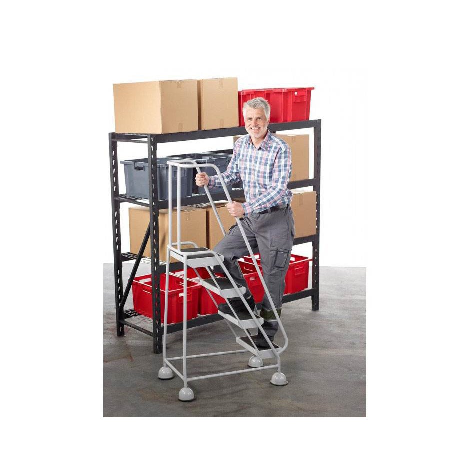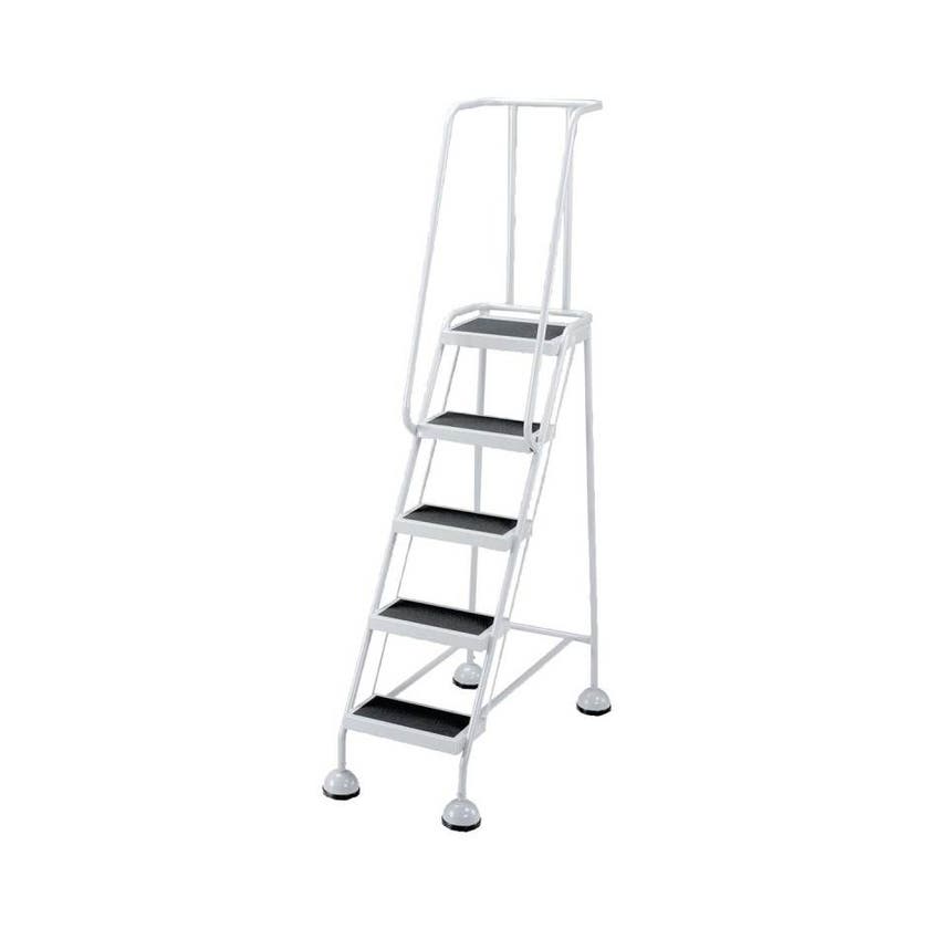 Smal säkerhetsstege med fem steg, som passar särskilt bra för användning i trånga utrymmen. Ram i 22 mm stålrör, epoxylackerat i grått. Rullar lätt på hjul som låses när trappan belastas. Höjd till översta steg 1270 mm samt total bredd 570 mm.