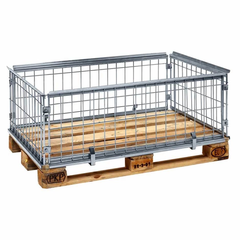 Elförzinkad pallram. Anpassad för EUR pall 1200 x 800 mm. Staplingsbar med belastning 800 kg. Vikt 18 kg. Nätmaska 65 x 120 mm. Invändiga mått L1150 x B740 x H400 mm. Vikt 18 kg. Levereras omonterad, enkel montering utan verktyg.