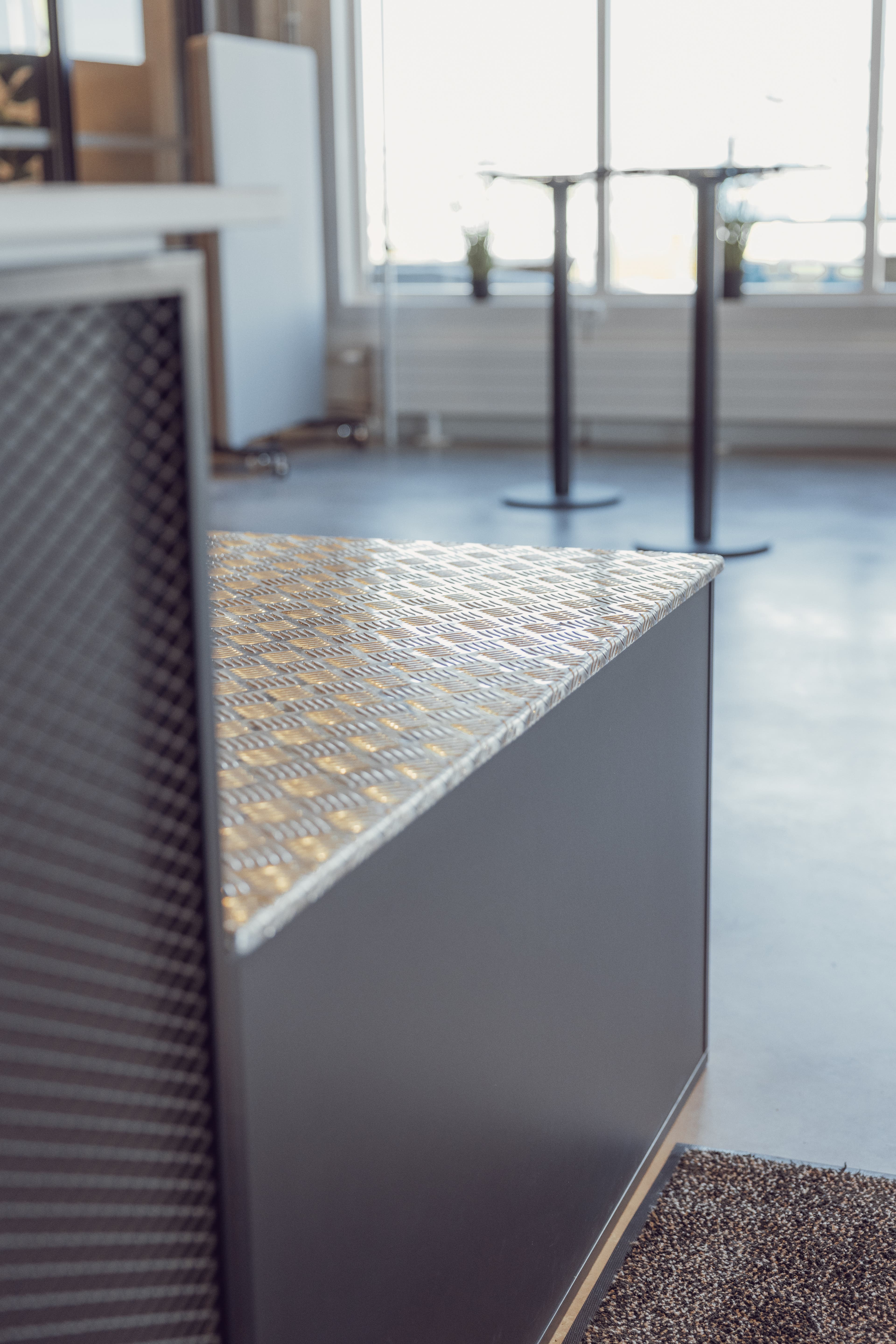 En särskilt viktig del i projektet var receptionen – ett område som både skulle tåla hårt slitage och samtidigt ge ett intryck som stämde med Ramirents profil. Tillsammans tog vi fram en specialdesignad receptionsdisk med industriell känsla, klädd i sträckmetall och med logotyp monterad i fronten. Det blev en lösning som både fungerar i praktiken och ger ett starkt första intryck.