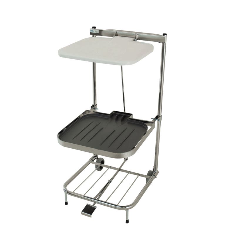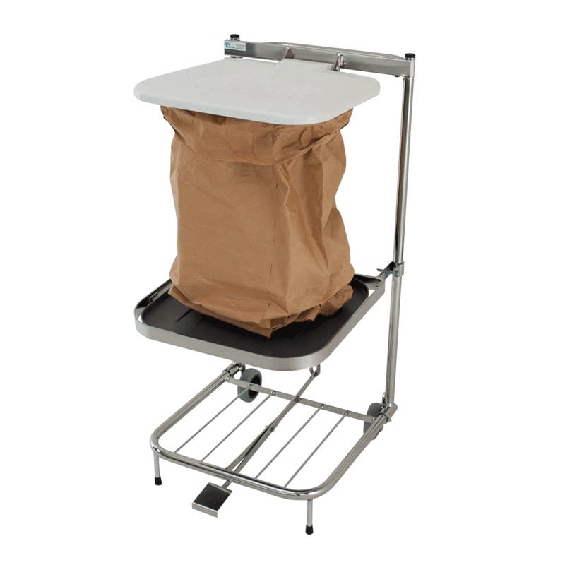 Stället har pedal och lock i vit färg. Bottenplatta förhindrar att tungt avfall trillar igenom säcken. Förflyttas enkelt med hjälp av 2 st 100 mm gummihjul. Mått B335 x D450 x H795 mm. Anpassad för 60 - 70-literssäck.