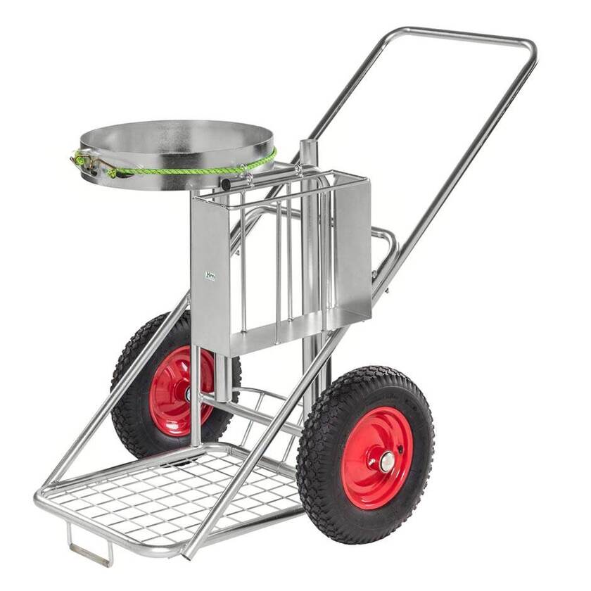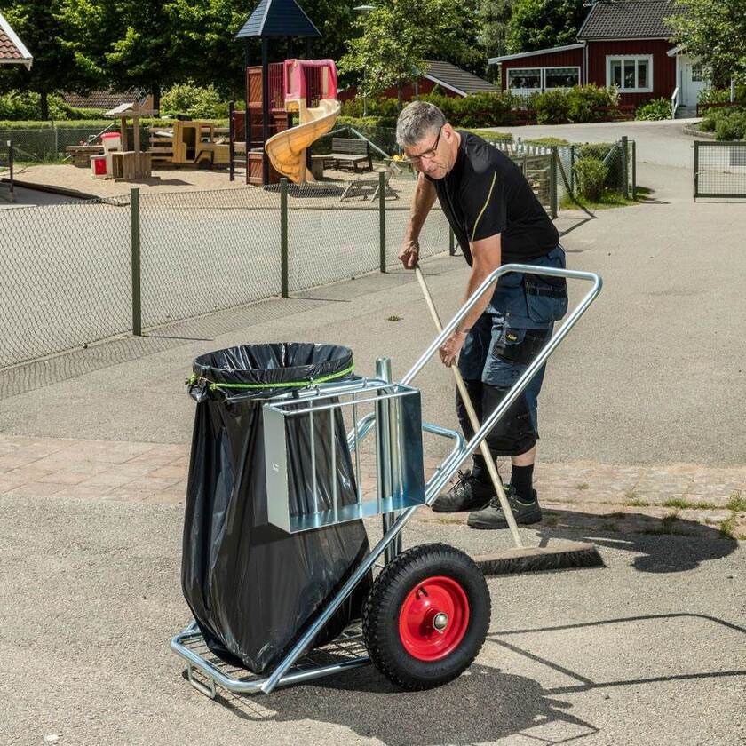 Städkärra för utomhusbruk. Städkärran har sopsäcksanordning med snabblåsning av säcken, 2 st rörhylsor för städverktyg samt korg för förvaring av sopsäckar. Valbara hjul, 2 st Ø400x100 mm luftgummihjul med plåtfälg alternativt Ø400 mm punkteringsfria hjul. Du väljer även färg på din städkärra mellan gult eller elförzinkat utförande. Max belastning 125 kg. Vikt 25 kg.