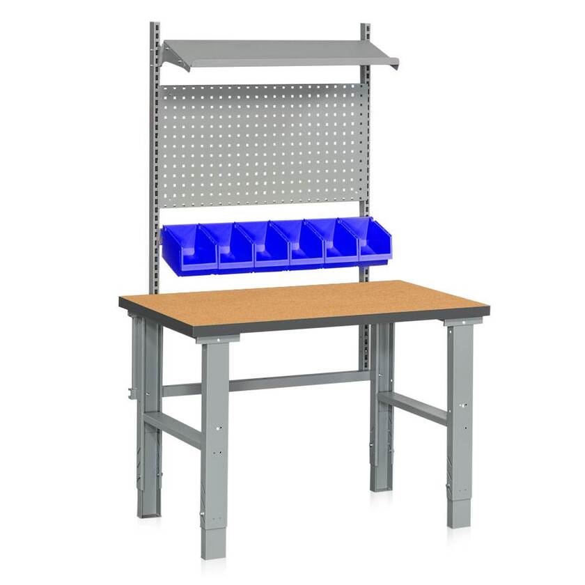 Komplett arbetsbänk med bordsskiva i oljehärdad board (1200x800x40 mm). 2 perforerade pelare (1448 mm), mellanstag (875 mm), påbyggnadsram (1120 mm), 2 monteringssatser för pelare, grå perforerad panel (896x480 mm), hyllplan (875x300 mm), grå upphängningsskena (900 mm) och 6 blå plastbackar (4 l). Pelarna är tillverkade av pulverlackerade stålprofiler.