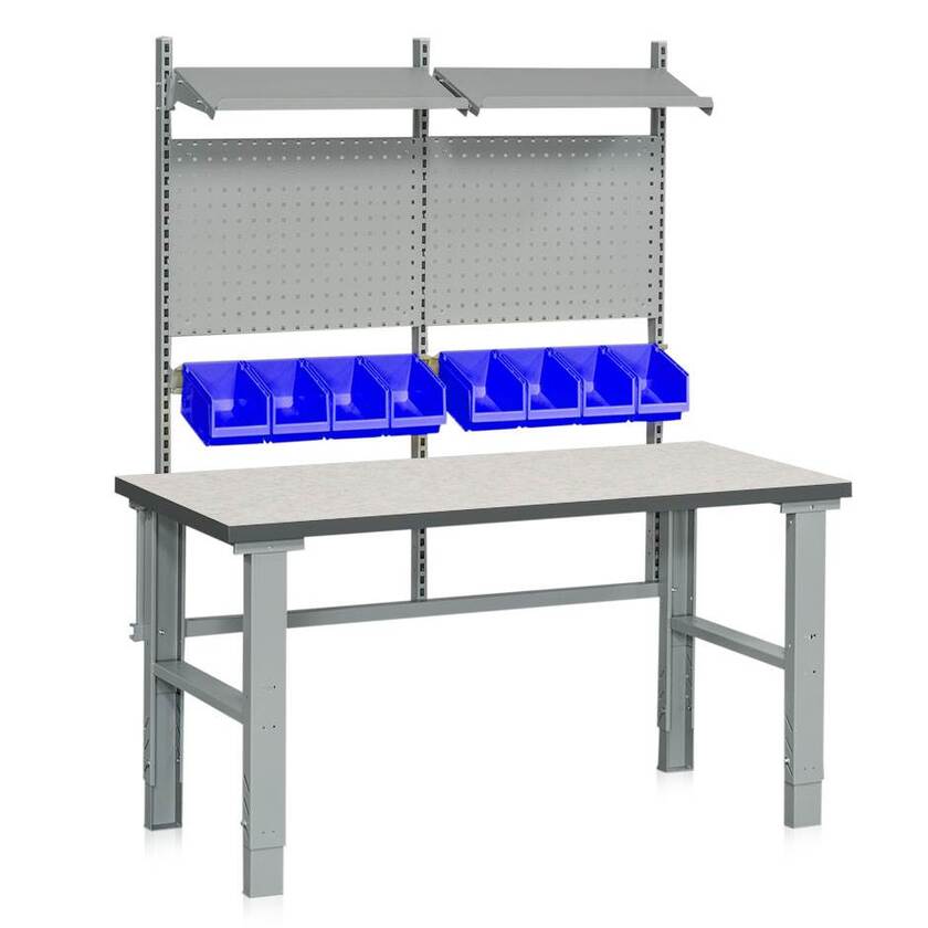 Komplett arbetsbänk med bordsskiva i oljehärdad board (1200x800x40 mm). 2 perforerade pelare (1448 mm), mellanstag (875 mm), påbyggnadsram (1120 mm), 2 monteringssatser för pelare, grå perforerad panel (896x480 mm), hyllplan (875x300 mm), grå upphängningsskena (900 mm) och 6 blå plastbackar (4 l). Pelarna är tillverkade av pulverlackerade stålprofiler.