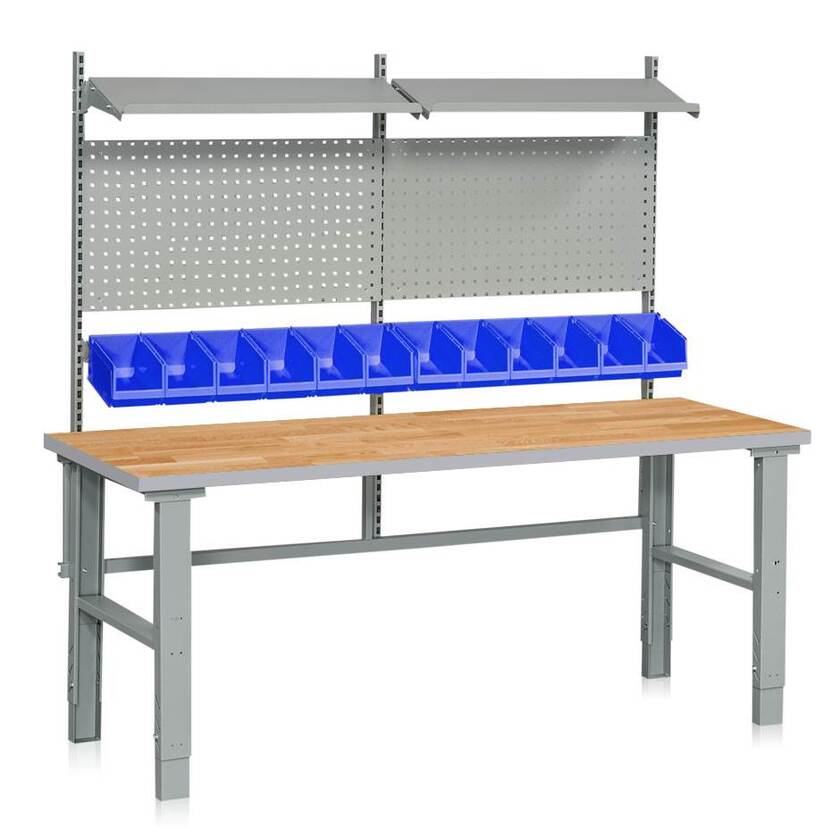 Komplett arbetsbänk med bordsskiva i oljehärdad board (1200x800x40 mm). 2 perforerade pelare (1448 mm), mellanstag (875 mm), påbyggnadsram (1120 mm), 2 monteringssatser för pelare, grå perforerad panel (896x480 mm), hyllplan (875x300 mm), grå upphängningsskena (900 mm) och 6 blå plastbackar (4 l). Pelarna är tillverkade av pulverlackerade stålprofiler.