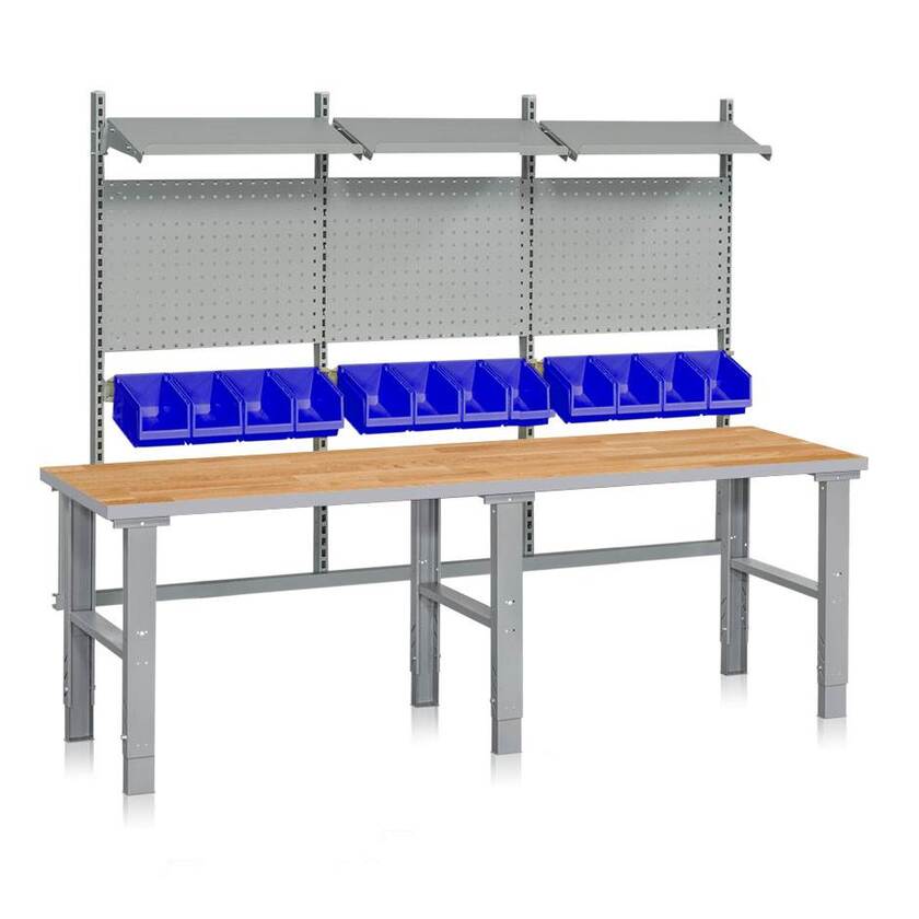 Komplett arbetsbänk med bordsskiva i oljehärdad board (1200x800x40 mm). 2 perforerade pelare (1448 mm), mellanstag (875 mm), påbyggnadsram (1120 mm), 2 monteringssatser för pelare, grå perforerad panel (896x480 mm), hyllplan (875x300 mm), grå upphängningsskena (900 mm) och 6 blå plastbackar (4 l). Pelarna är tillverkade av pulverlackerade stålprofiler.