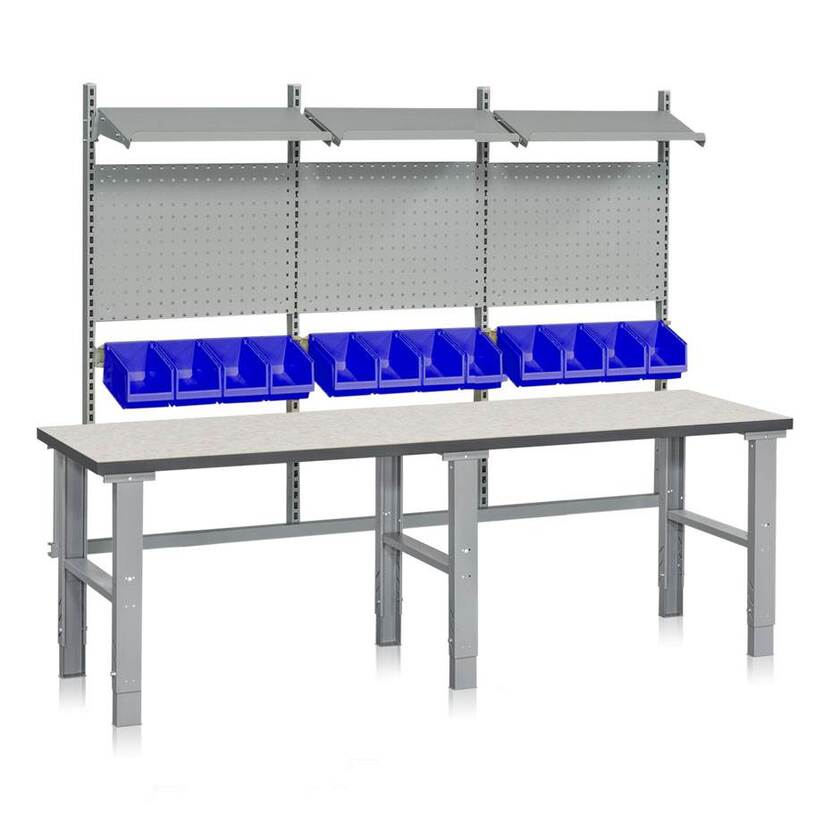Komplett arbetsbänk med bordsskiva i oljehärdad board (1200x800x40 mm). 2 perforerade pelare (1448 mm), mellanstag (875 mm), påbyggnadsram (1120 mm), 2 monteringssatser för pelare, grå perforerad panel (896x480 mm), hyllplan (875x300 mm), grå upphängningsskena (900 mm) och 6 blå plastbackar (4 l). Pelarna är tillverkade av pulverlackerade stålprofiler.
