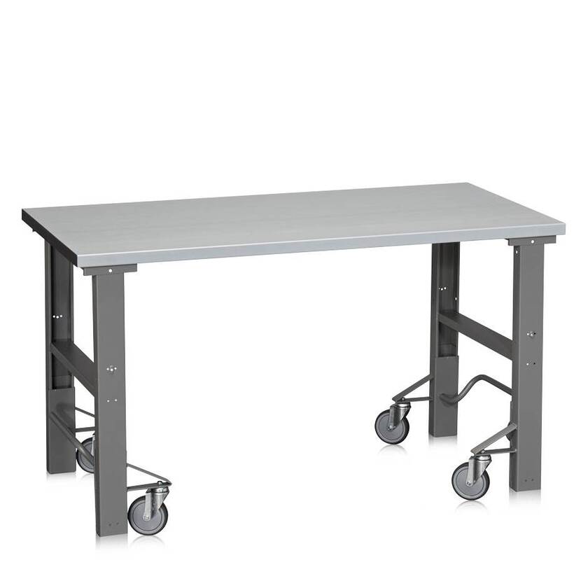 Arbetsbänk PROFFS med hjul, 2000 x 800 mm, ställbar höjd 745-1015 mm, Plåtbeklädd grå