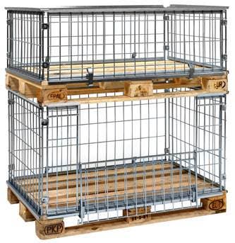 Elförzinkad pallram, EUR-mått, med halvhängd grind på ena långsidan. Staplingsbar med belastning 800 kg. Nätmaska 65 x 120 mm. Invändiga mått L1150 x 740 x H1000 mm. Levereras omonterad, enkel montering utan verktyg. Monteras på EUR-pall 1200 x 800 mm. Som tillbehör finns även vagnunderrede med 200 x 50 mm massivgummihjul.