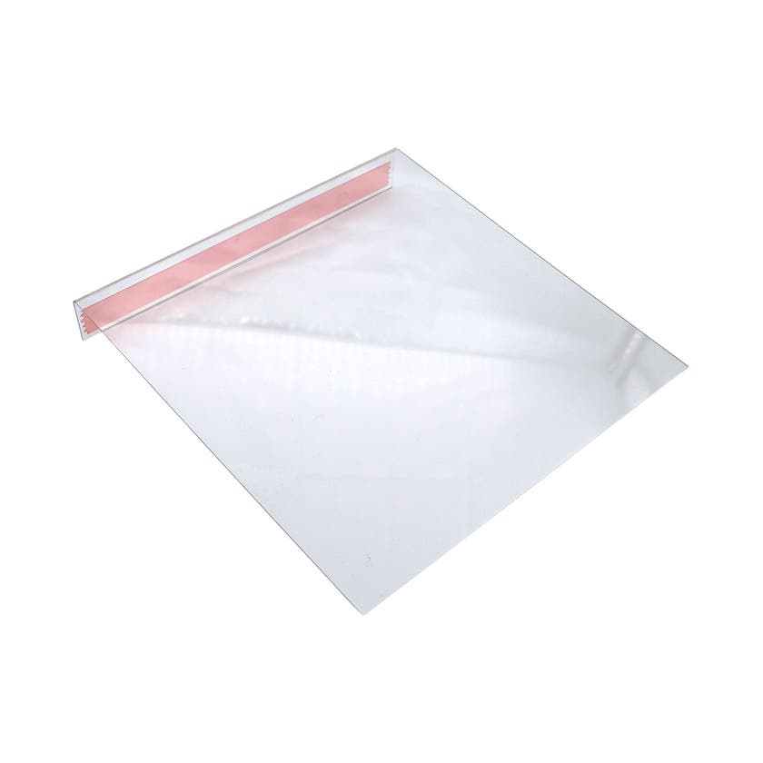 Omonterad skylt som är vinklad 90º. Fästs med tejp. Klisteretiketter av vinyl eller papper kan monteras på.