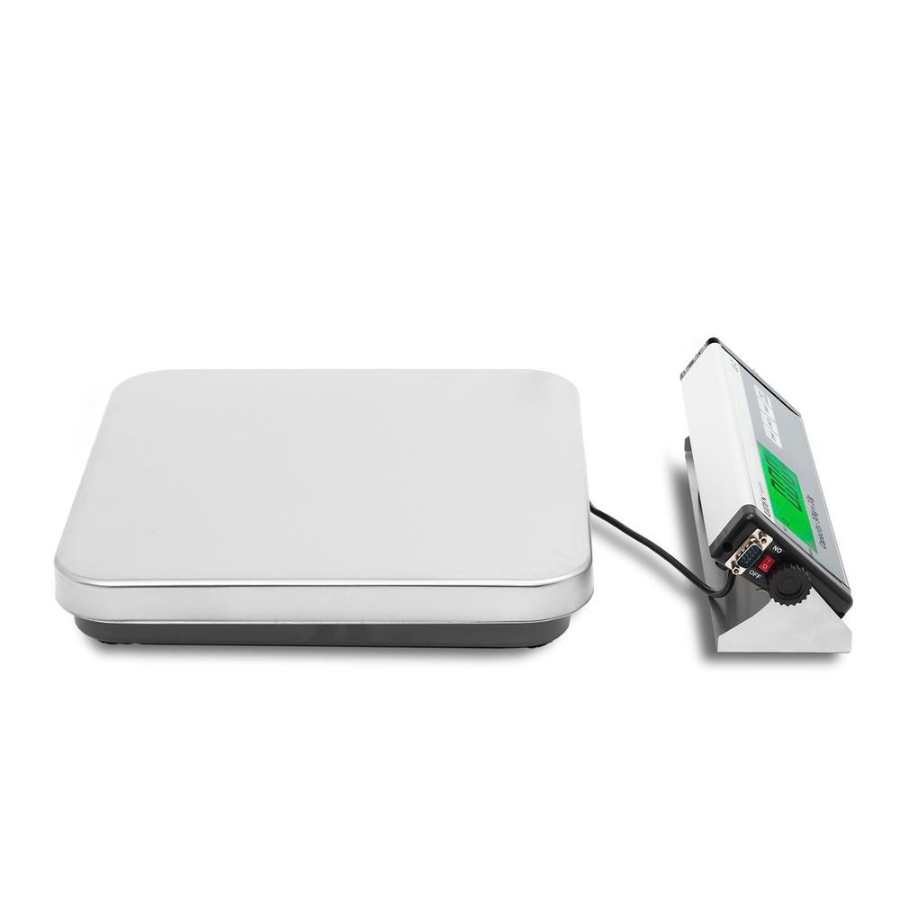 En paketvåg med robust konstruktion i rostfritt stål. Batteriladdare och adapter medföljer. Tydlig LCD-display med väggfäste. Displayens mått 270 x 90 mm, Kapacitet 60 kg, Plattform 325 x 320 mm (B x D), Upplösning g: 20