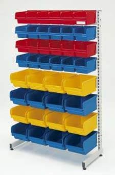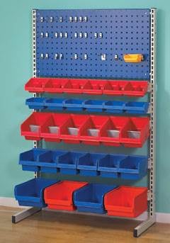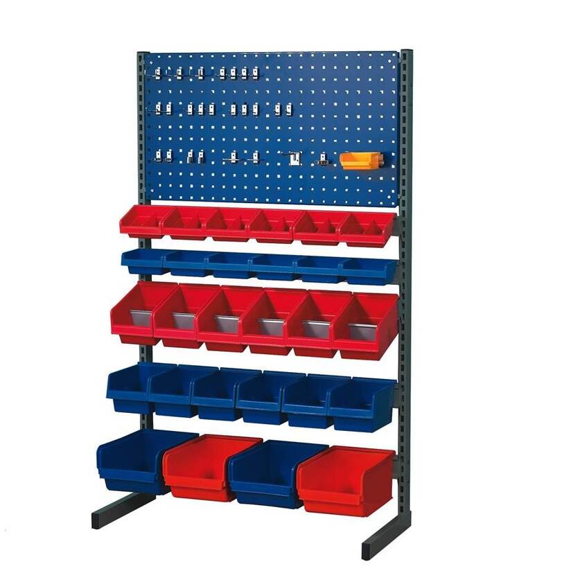 Fristående golvställ med enkelfot som kan justeras för bästa stabilitet med hjälp av ställfötter. Levereras med 2 st pelare komplett med L-fot och 2 st mellanstag, H:1525 x B:925 x D:415 mm. Stället kombineras efter eget önskemål med upphängningsskena för lagerlådor samt verktygspanel. Stället finns också som dubbelställ, med eller utan hjul, samt som väggställ.