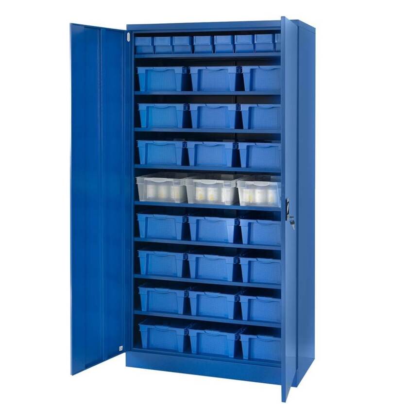 Förvaringsskåp som levereras komplett med 8 st flyttbara hyllplan, 24 st plastbackar samt 8 st plocklådor.