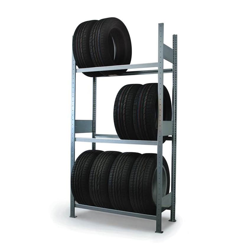 Startsektionen består av två gavlar och tre plan. Balkarna är utformade för att ge en skonsam lagring och på så vis öka livslängden på dina däck. För längre hyllsektioner kompletterar du med en påbyggnadssektion, som kopplas efter startsektionen. Glöm inte att tänka på säkerheten. För maximal stabilitet bör din hylla förankras i golv. Montagesats för bultning i golv finns som tillbehör.