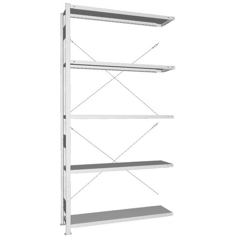 Påbyggnadssektionen har en gavel och kopplas efter en startsektion. Hyllplanen är flyttbara i 25 mm steg.