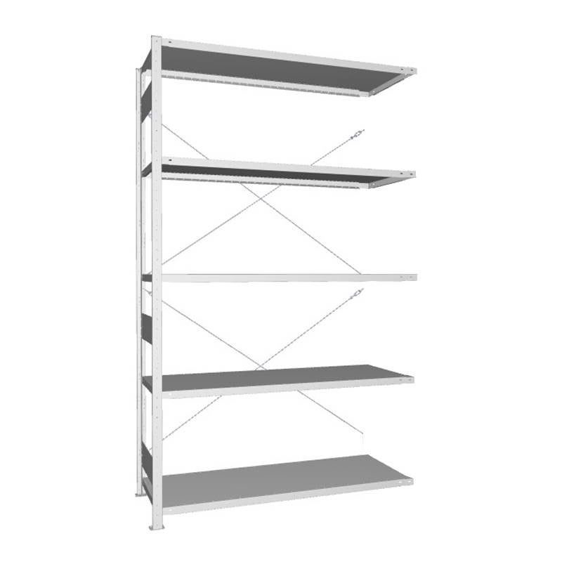 Påbyggnadssektionen har en gavel och kopplas efter en startsektion. Hyllplanen är flyttbara i 25 mm steg.