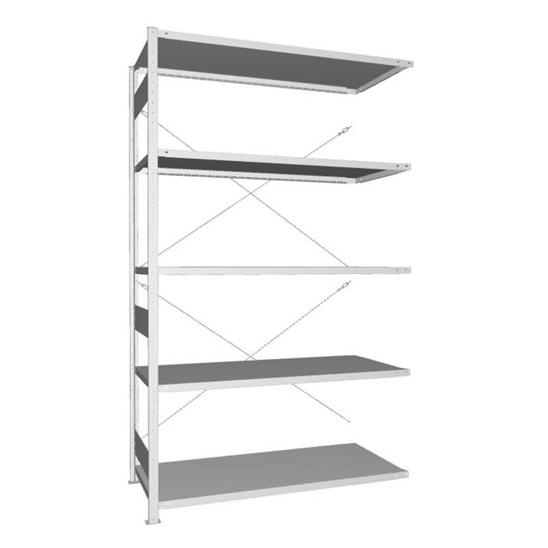 Påbyggnadssektionen har en gavel och kopplas efter en startsektion. Hyllplanen är flyttbara i 25 mm steg.