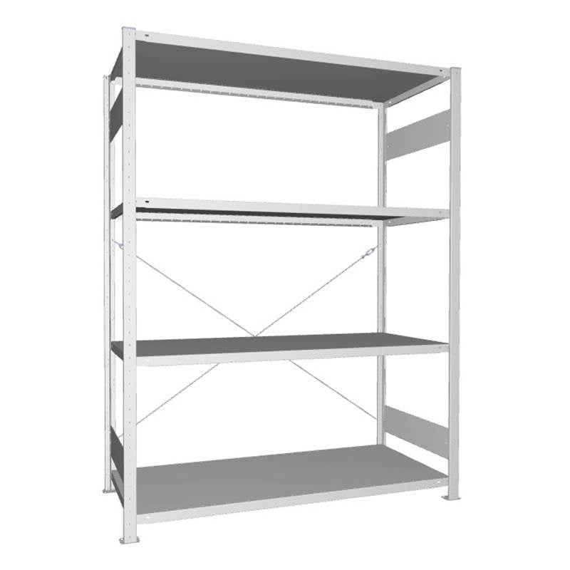 Startsektionens hyllplan är flyttbara i 25 mm steg. Lackerad i ljusgrå färg (RAL 7035) Hyllan är 1500 mm bred. Djup och höjd är valbart, 400, 500 eller 600 mm djup. 2000 eller 2500 mm höjd.