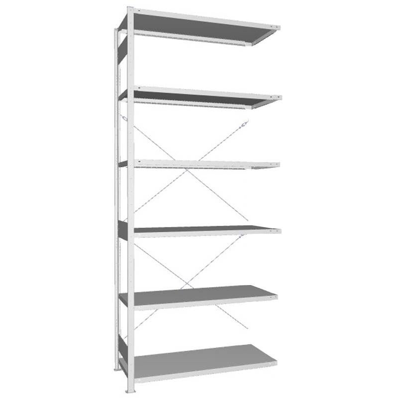 Påbyggnadssektionen har en gavel och kopplas efter en startsektion. Hyllplanen är flyttbara i 25 mm steg.