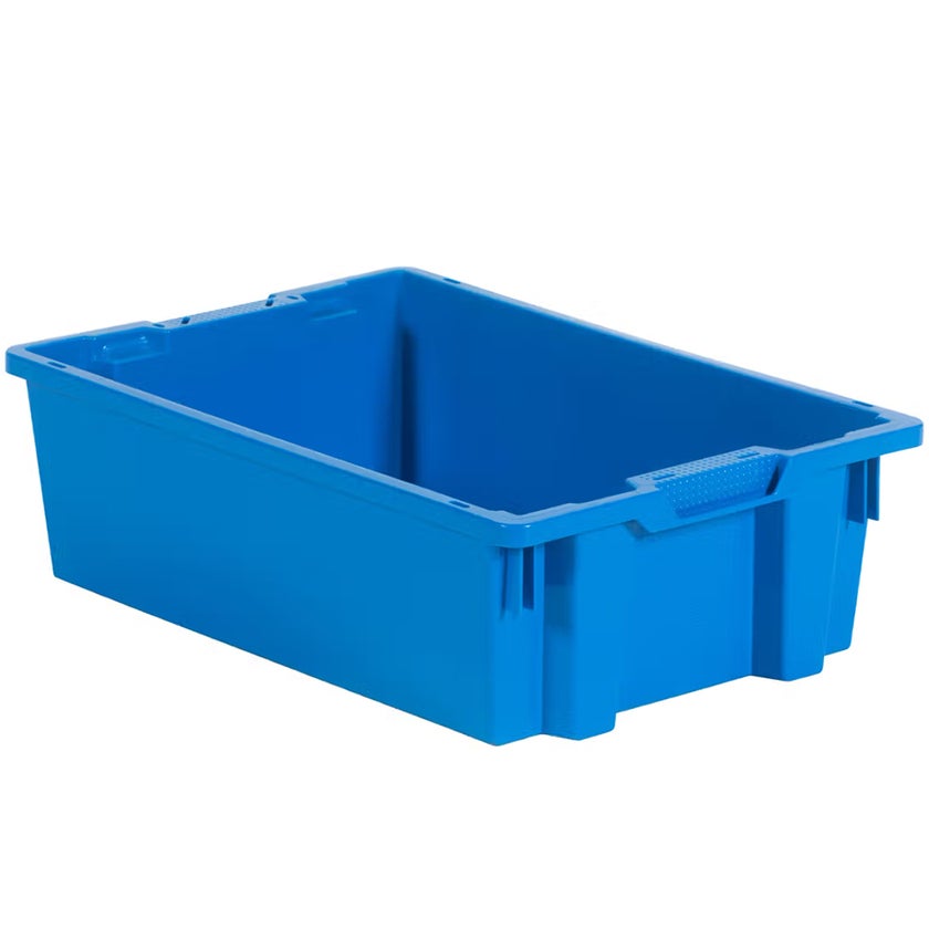 Staplingsbara plastbackar som även kan travas i varandra genom att vrida dem ett halvt varv. Backen har släta ytor, som är lätta att hålla rena. Yttermått L600 x B400 x H180 mm. Välj mellan färgerna blå, vit, röd eller grön. Som tillbehör finns "vanligt" eller vikbart lock. Backarna kan präglas med firmanamn, logo eller löpande numrering - kontakta oss för prisförslag.