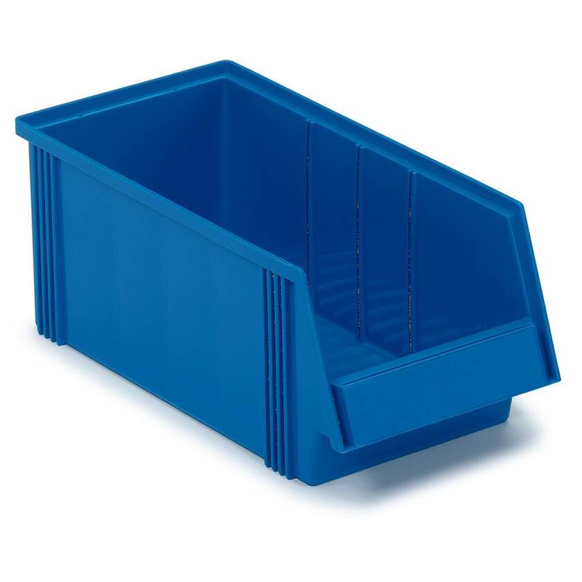 Lådans botten är korrugerad, vilket hindrar smådelar att glida undan och underlättar plockning. Den låga fronten gör att lådans innehåll blir synligt samt lätt och snabbt kan plockas.