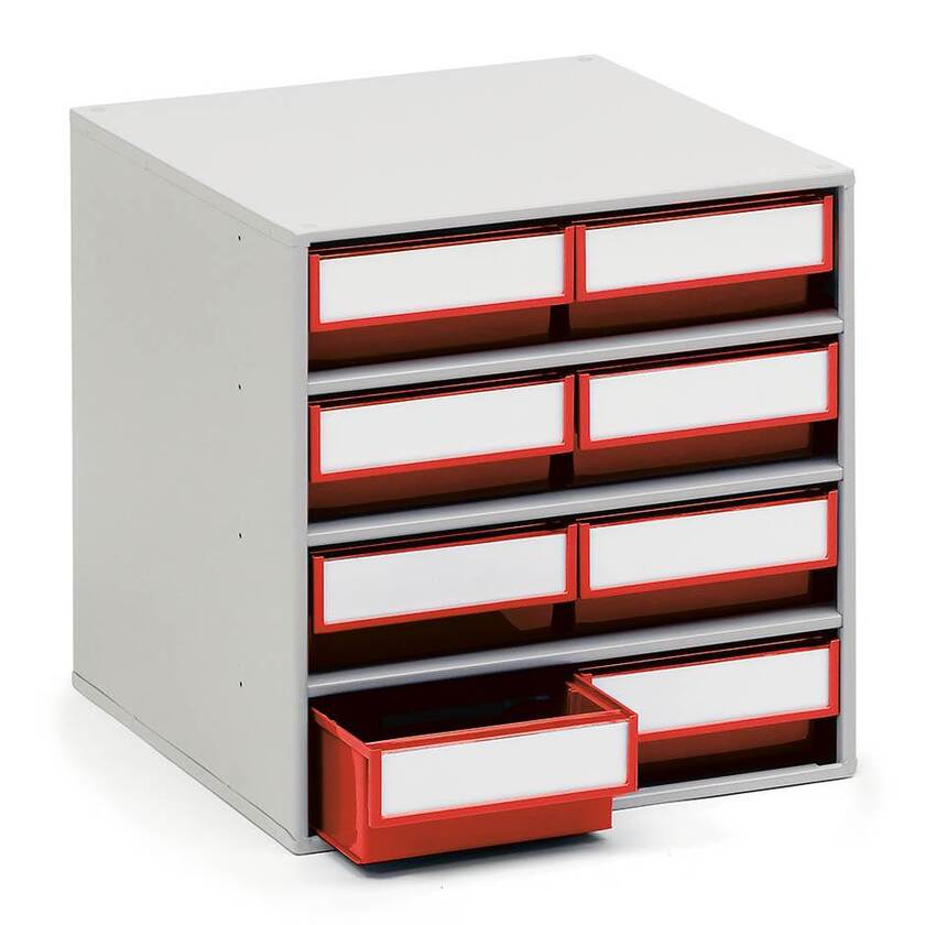Lagerkassett Treston 0840, består av 8 lagerlådor. Kassettramen är av grå stål. Välj mellan 8 färgade eller 8 glasklara lagerlådor.
