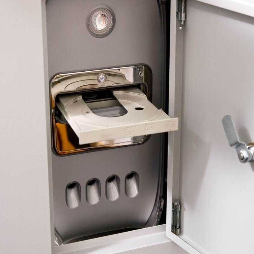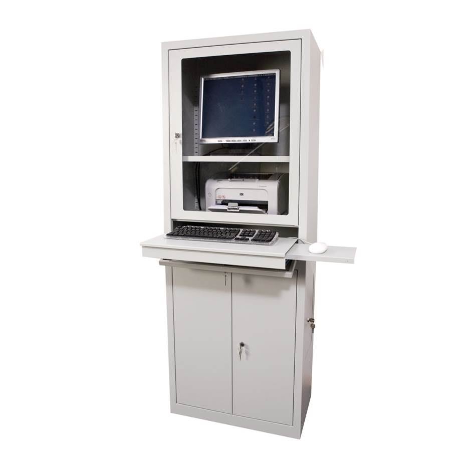 Skåpet har separat lucka med utdragbart tangentbord med musplatta för båda höger- och vänsterhänta. Flyttbara hyllplan med kabelgenomföring i både över- och underskåp. På skåpets högra sida finns en lucka som används för att komma åt datorn. Alla luckor är låsbara. Försett med energipanel med 6 st jordade uttag samt ventilationsfläkt med filter.