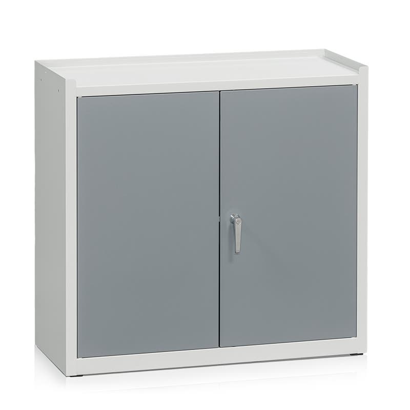 Helsvetsat verktygsskåp, B:950 x D:450 x H:900 mm, med ett flyttbart hyllplan och två utdragbara förvaringslådor. Kraftiga dubbeldörrar som låses med L-handtag, 2 nycklar ingår. Avlastningsplan med raskant på ovansidan. Lackerat i grå färg. Som tillbehör finns hjulunderrede med broms, extra hyllplan samt lådindelning i plåt. Finns också som enkelskåp.