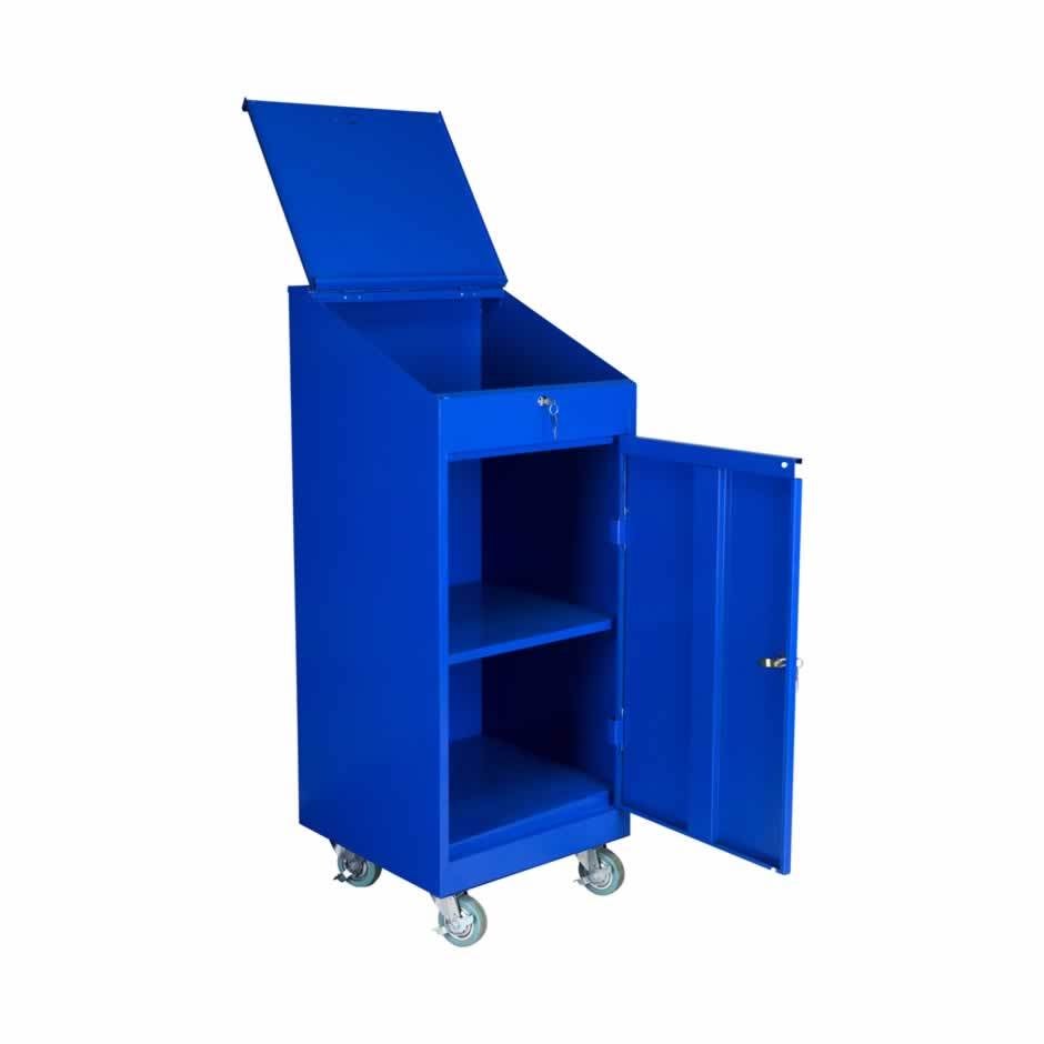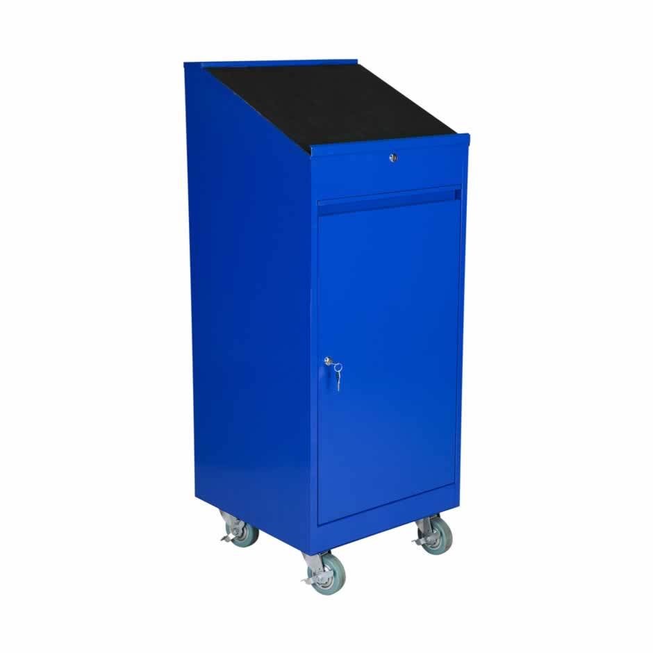 Mobilt verktygsskåp som levereras monterat. Försett med 1 st fast hyllplan, gummiklädd skrivpulpet och pennfack. Både dörr och skrivpulpet är låsbart med cylinderlås. 4 st bromsade massivgummihjul. Höjd i framkant: 1100 mm. Vikt 35 kg. Pulverlackerat i blå färg.