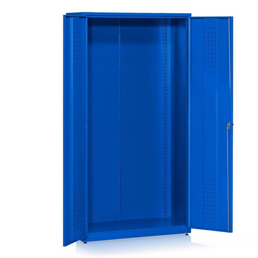 På skåpet finns justerbara fötter så att det ska stå stadigt även om det är ojämnt underlag. Skåpet klarar av en belastning på sammanlagt 1000 kg. Mått B1020 x D540 x H2000 mm. Pulverlackerat i blå färg.