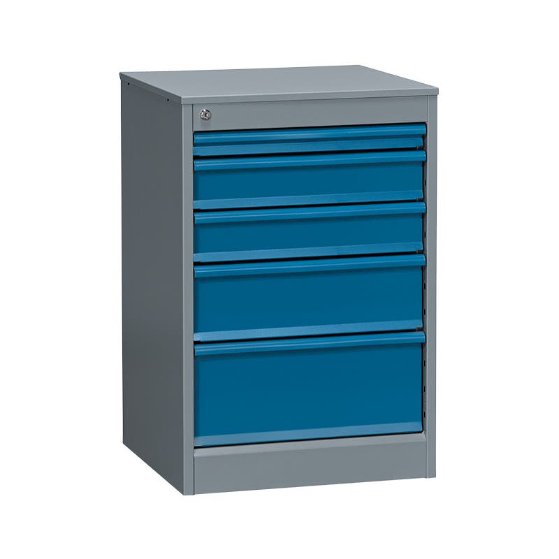 Hurtsen har 5 lådor med lådhöjderna 1 x 50 mm + 2 x 100 mm + 1 x 150 mm + 1 x 200 mm. Kapacitet 50 kg/låda. Mått B535 x D500 x H800 mm. Försedd med centrallås.