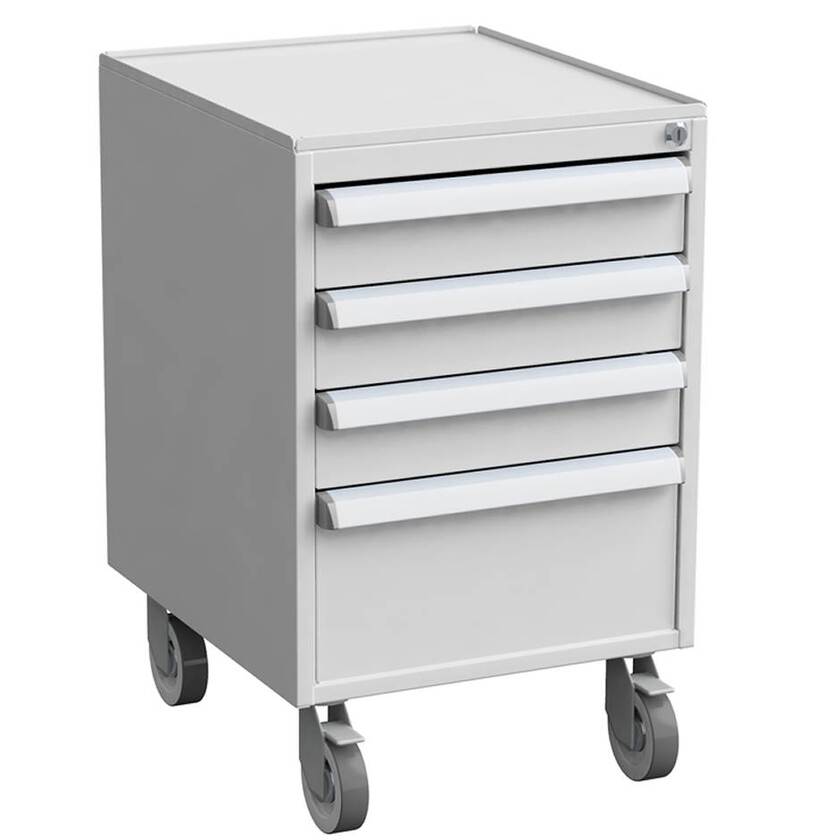 4-lådig stålhurts på hjul, utrustad med centrallås för säker förvaring av verktyg. Pulverlackerad i grå RAL7035. Helbreda aluminiumhandtag. Lastkapacitet 120 kg. Utvändigt mått 450x520x700 mm. Lådhöjder 100/100/100/200 mm.
