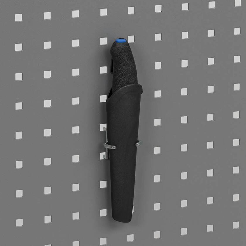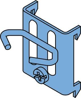 Bygelkrok, längd 43 mm, tjocklek 5 mm, bredd 20 mm, för verktygspanel. Hakas i plåtens perforering och låses med en spetsig stoppskruv, som levereras iskruvad. Används för upphängning av hammare och liknande små handverktyg.