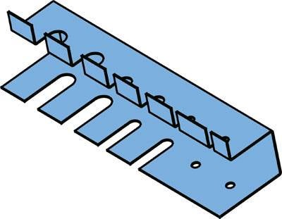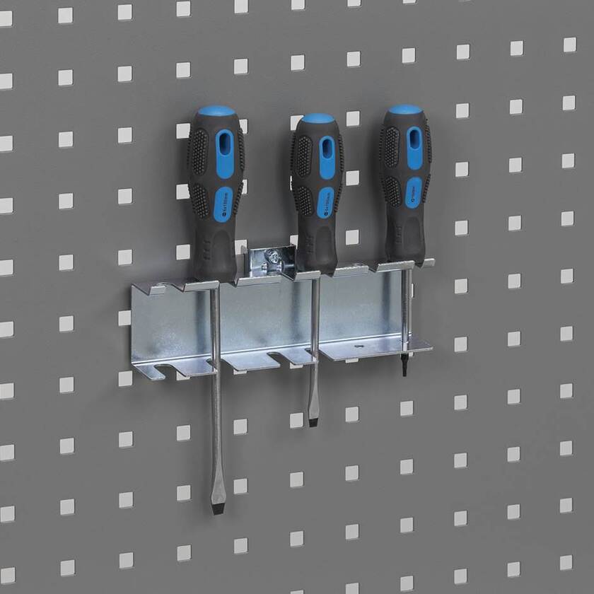 Mejselhållare, 190 mm, för verktygspanel. Hakas i plåtens perforering och låses med en spetsig stoppskruv, som levereras iskruvad. Används för upphängning av skruvmejslar och liknande små handverktyg, plats för 6 mejslar.