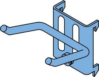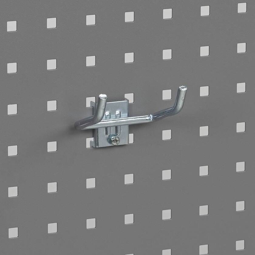 Vinkelkrok, längd 50 mm, tjocklek 5 mm, bredd 40 mm, för verktygspanel. Hakas i plåtens perforering och låses med en spetsig stoppskruv, som levereras iskruvad. Används för upphängning av hammare och liknande små handverktyg.