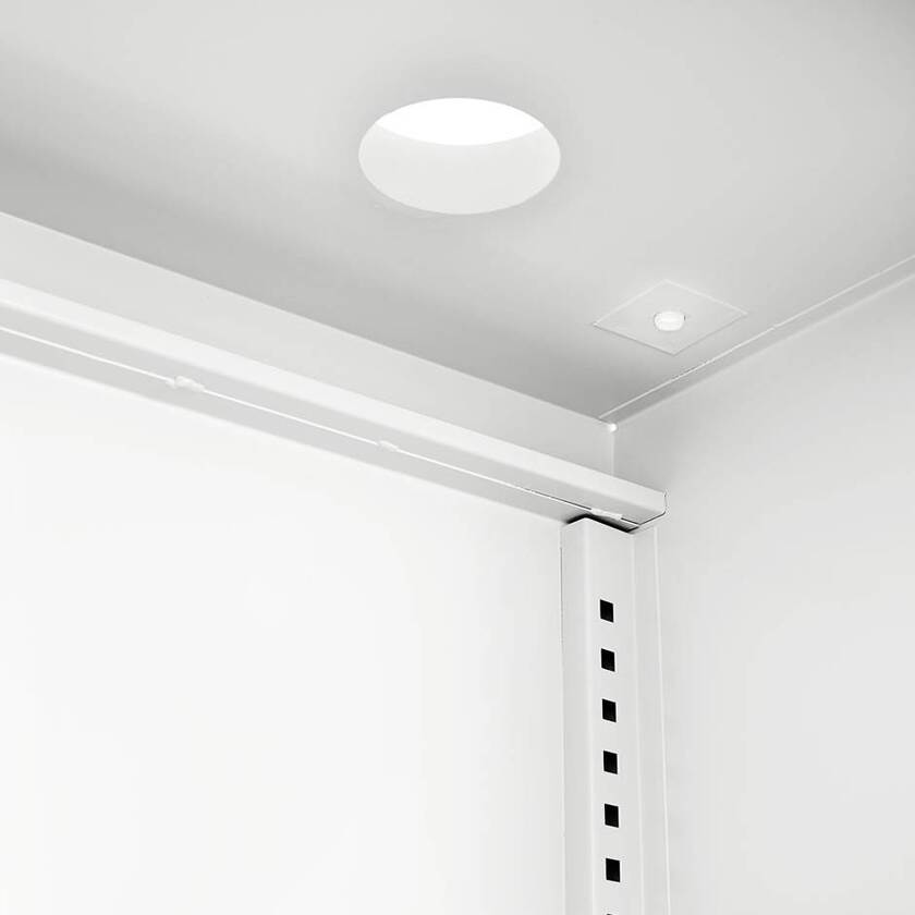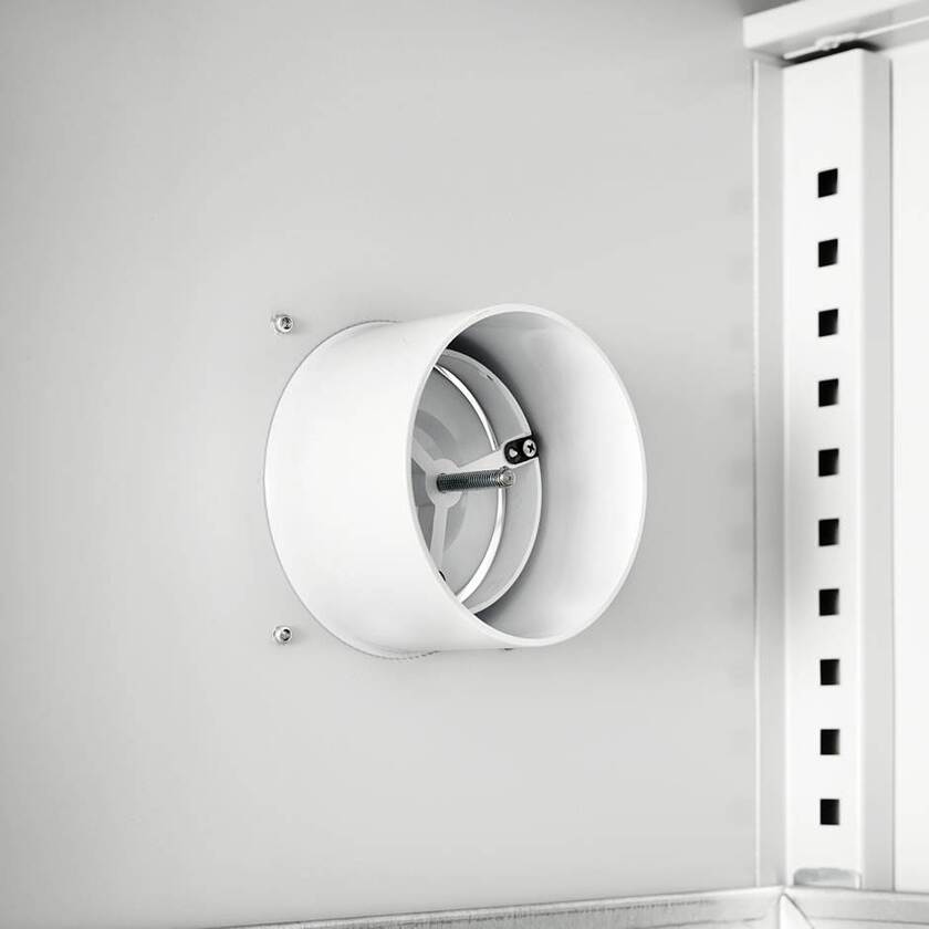 Tätsvetsade uppvikta kanter på hyllplanen. Max last 70 kg per hyllplan. Kraftiga ryggskenor som du använder både för hyllplan och utdragbar låda. Ventilationsinsatser på skåpets sida och anslutningstos i toppen. Skåpet har grå stomme RAL 7035 och blå dörrar RAL 5010.